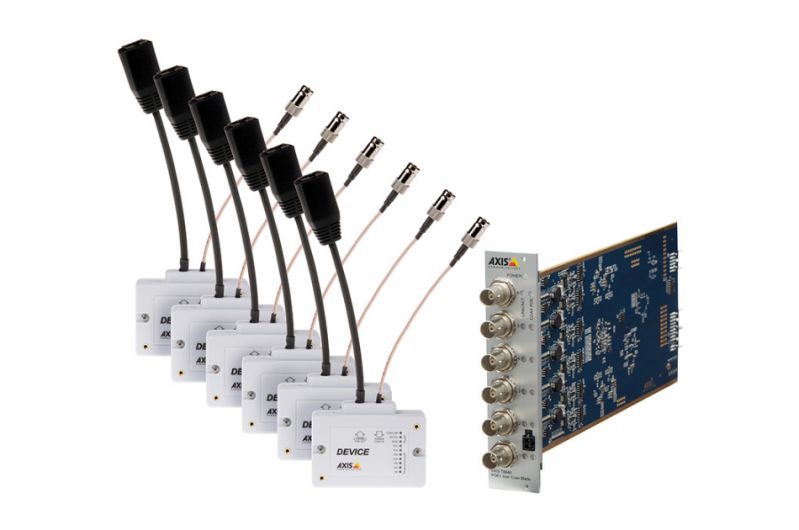 AXIS T8648 PoE+ Coax Blade Compact Kit contains one (1) AXIS T8646 PoE+ over Coax Blade and six (6) AXIS T8643 POE+ over Coax Compact for a complete 6 channel solution with improved installation and cable management as it can easily be integrated in housings and backboxes.