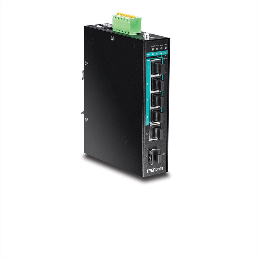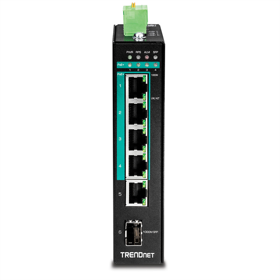 TRENDnet TI-PG541 ist ein zuverlässiger, unverwalteter PoE+ Switch mit DIN-Schiene, Schutzklasse IP30 und gehärteten Komponenten, die für extreme industrielle Umgebungen zertifiziert sind. Er bietet vier Gigabit PoE+ Ports (Ports 1-4, 802.3at), einen Gigabit-Port, einen SFP-Slot und ein Voll-PoE Power Budget in Höhe von 120 Watt. Duale redundante Stromversorgung (Netzadapter separat erhältlich) mit Überlastschutz wird Zero-Downtime -Anforderungen gerecht. Bei Ausfall der primären und/oder sekundären Stromversorgung kann ein Alarm ausgelöst werden.