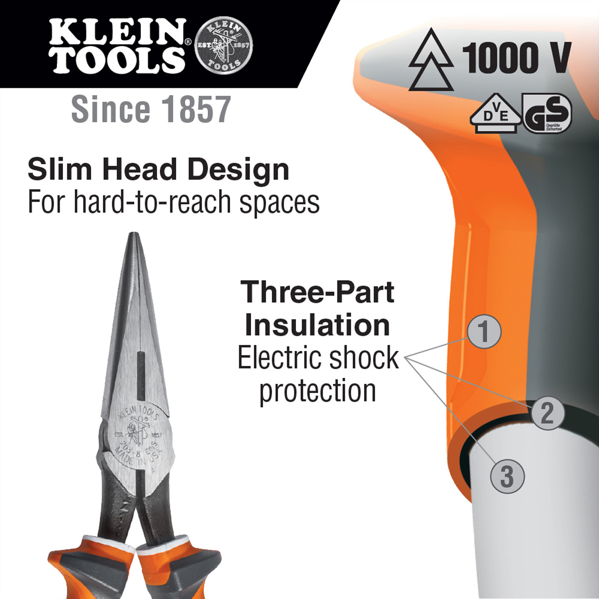 - Langlebige, geformte Isolierung erfüllt bzw. übertrifft die Anforderungen von ASTM F1505 und IEC 60900 für isolierte Werkzeuge