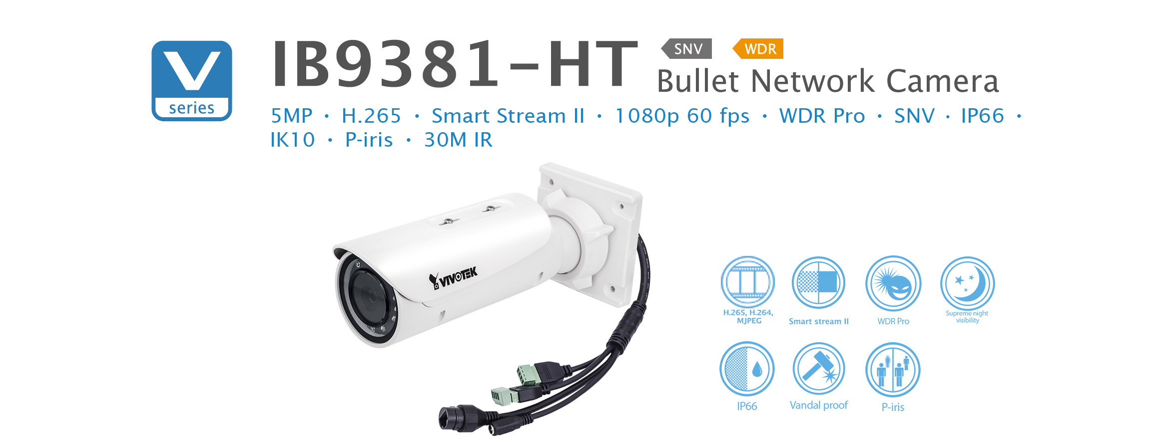 Die VIVOTEK IB9381-HT ist eine brandneue, hocheffiziente und professionelle H.265 Netzwerkkamera mit bis zu 30 Bildern pro Sekunde bei 5-Megapixeln oder 60 Bildern pro Sekunde bei einer Auflösung von 1080p (1920 x 1080) mit einer herausragenden Bildqualität.